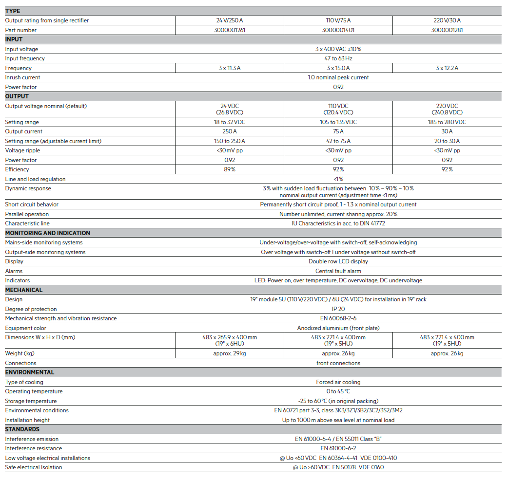 The Switch Mode Power Supply (SMPS) AC 7000 N1 is the new generation of the proven AC 7000 series from AEG Power Solutions. The reliable rectifier is very compact (19″), robust and ideal for all types of industrial applications. The output power of the system is 8000 W at 24, 110/120 and 220 VDC. Thanks to advanced protection (input, output, temperature, current, power) AC 7000 N1 is highly reliable and benefits of a high MTBF. The rectifier provides secured DC power in combination with a parallel battery, to supply all types of DC consumer loads including constant voltage and current sources.