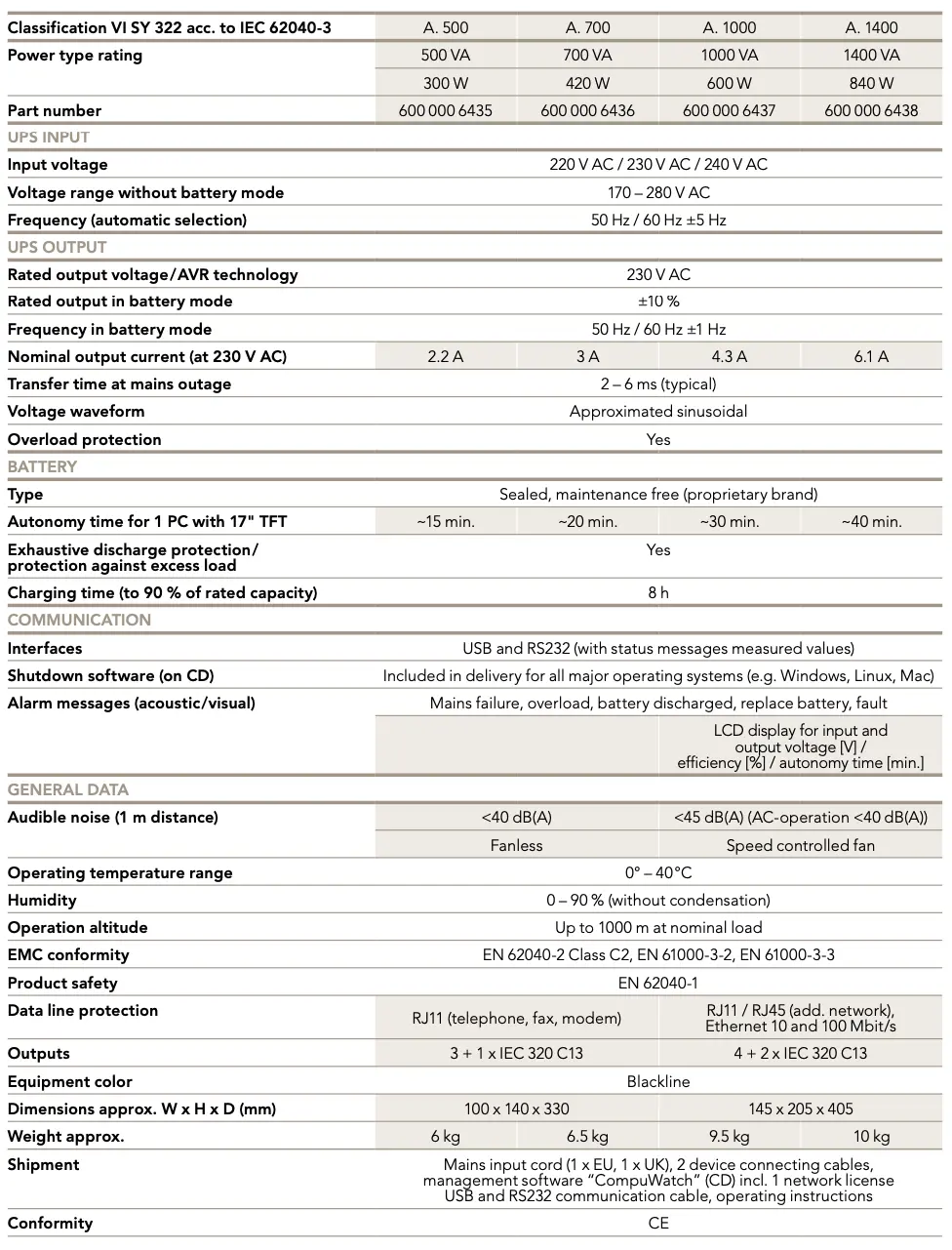 The reliable “One-Board-Design“ and the front LCD clearly informs the user about the most important aspects of the operating status. The new designed front LCD of the Protect A.1000 and A.1400 conforms to the special requirements of the users and provides a special fast and clear overview. All models are characterized by their clear graphical display, acoustic alarm, automatic 50/60 Hz recognition and last but not least it can be used immediately as all cable sets are supplied.