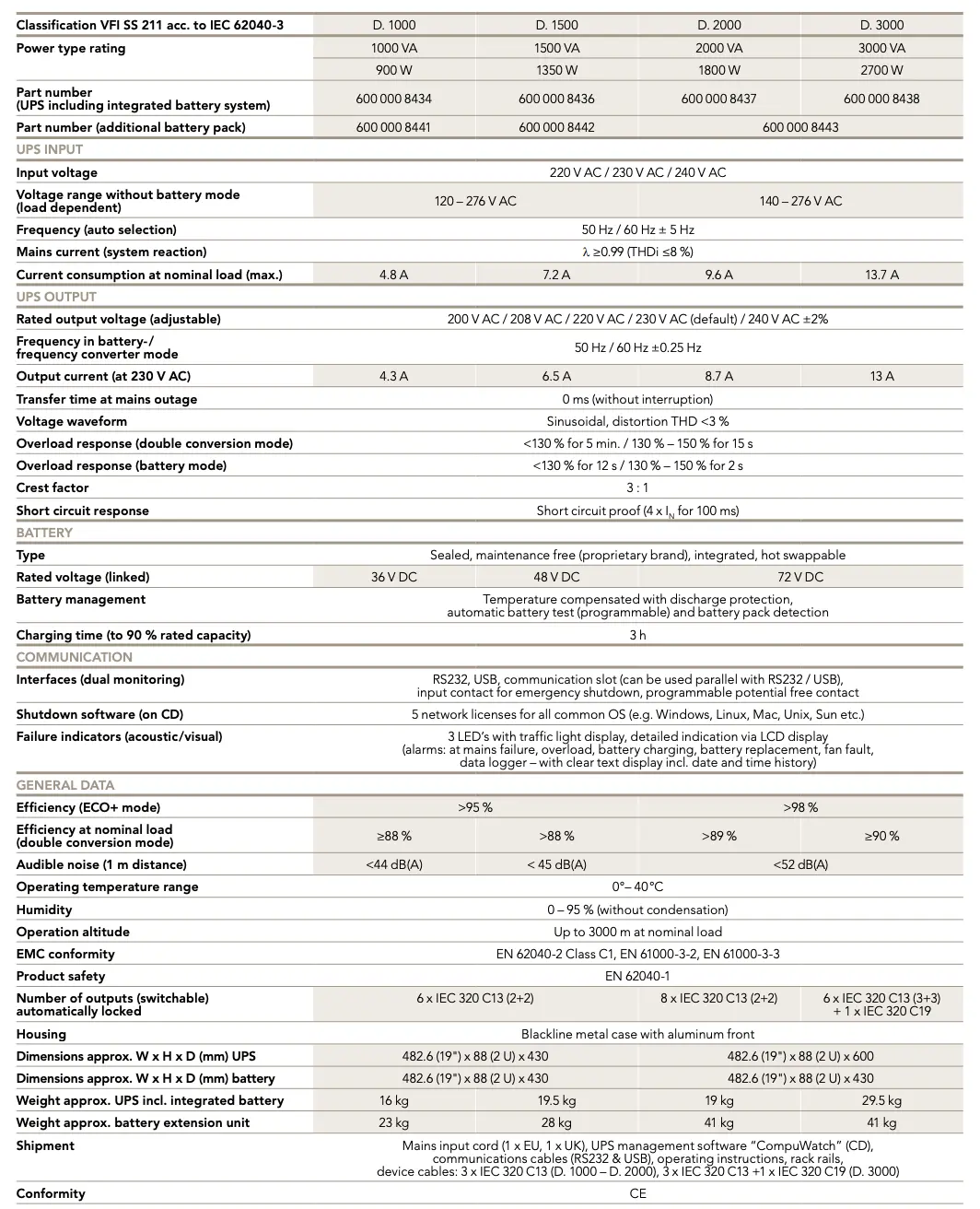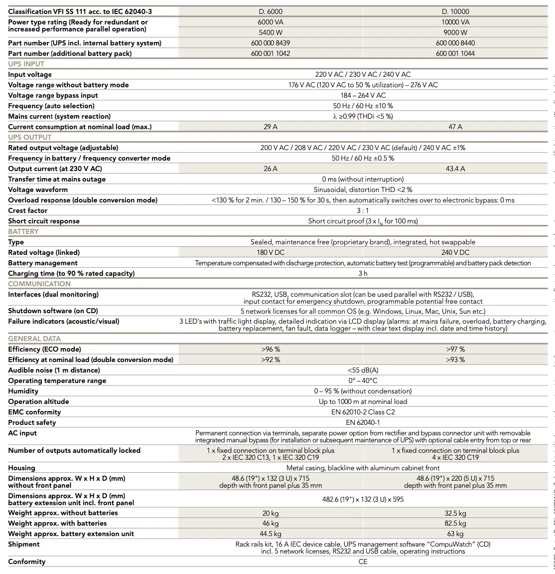 Thanks to their compact design, the devices can also be used in IT cabinets with a depth of only 800 mm. Protect D. 6000 including battery, connection unit and manual bypass unit fits within 3 standard height units. The 10 kVA version, with a complete battery system, connection unit and integrated manual maintenance bypass fits within 5 standard height units. The sophisticated design with removable connection unit and battery systems with plug-in technology make the assembly in the rack and the electrical installation as easy as possible. The weight is unimportant as the batteries can be mounted at the end of the installation.