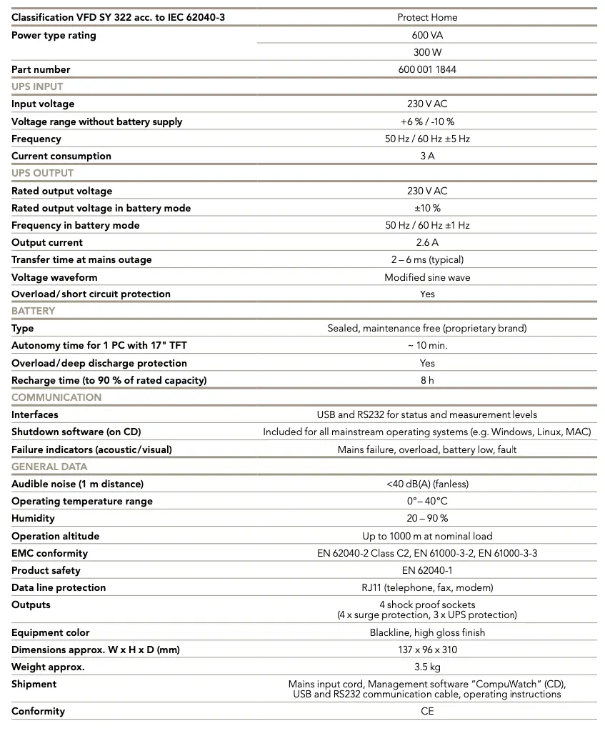 Protect Home offers high availability with overload and excess voltage and surge protection for PC, Mac, telephone, faxe and modem via direct connection to the UPS outlets. LED and audible alarm notification provides clear information about the most important operating conditions. Via the USB or RS232 interface a PC can be connected to operate using the “CompuWatch” software.